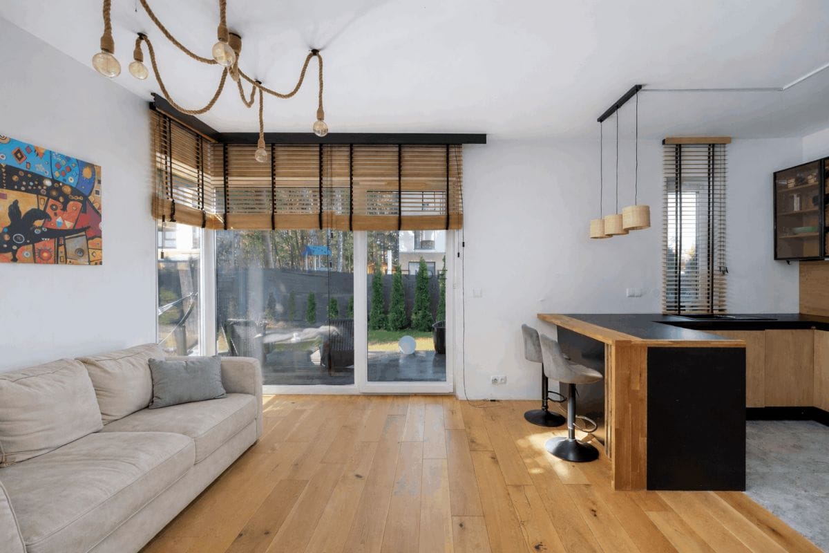 jasny i przestronny salon z miejscem na aneks kuchenny,