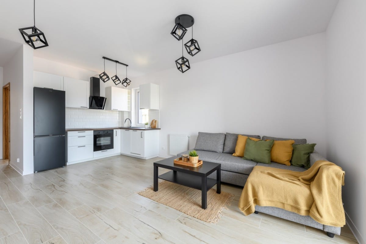 Salon z aneksem kuchennym i wyjściem na taras